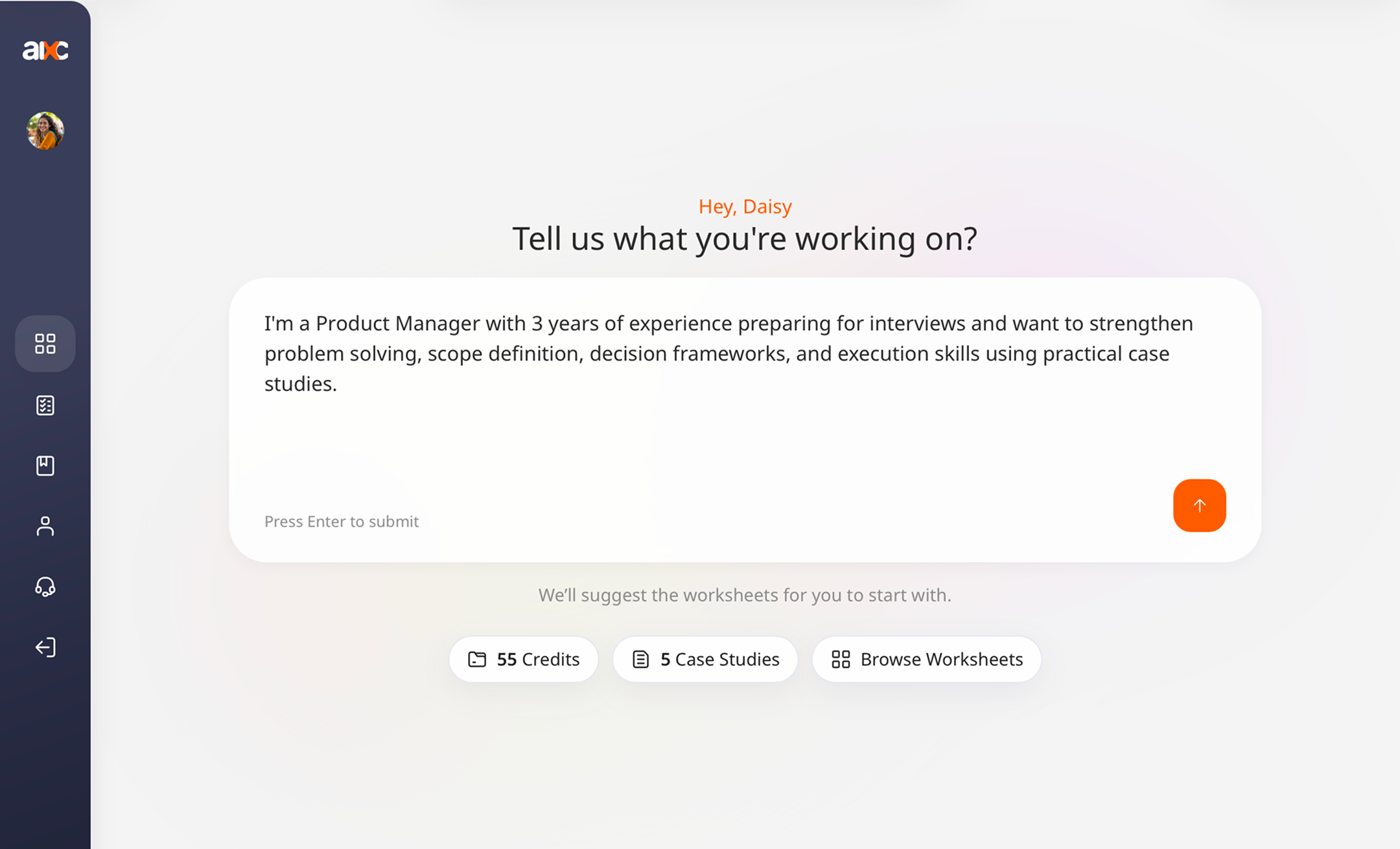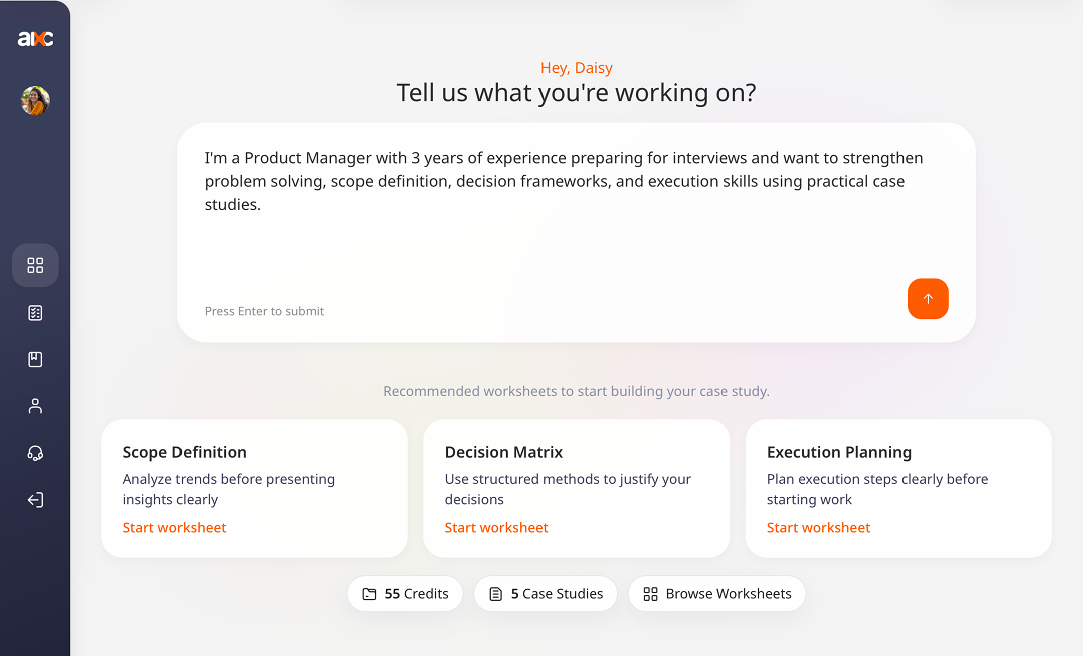 AIxCompass helps you prepare for interviews through skill-based worksheets. Each worksheet focuses on a key interview skill, guiding you to think clearly, apply your knowledge, and build structured responses.