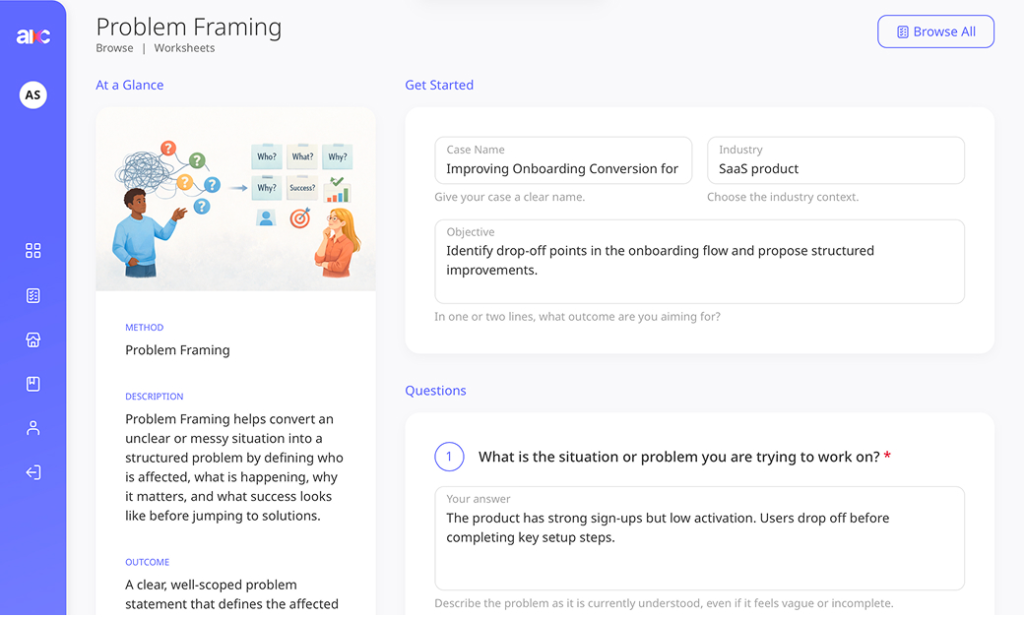 Getting started with AIxCompass takes just a few minutes. Simply choose a worksheet, answer a set of questions, and generate your case study. The platform guides your thinking step by step, helping you move from raw ideas to a structured case study with clarity and confidence.